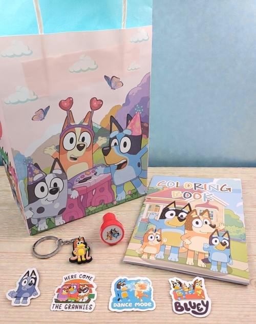 Jump into the world of Bluey with these super-fun Party Bags! This kit includes everything you need for 5 bags - and all the treasures inside feature one of the Bluey characters! (random selection of pictured designs)